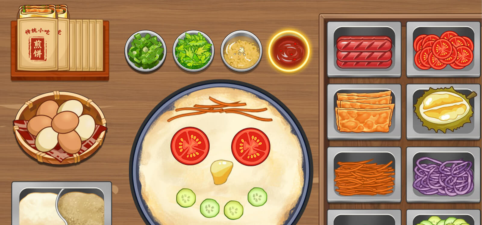 游戏中会面对各种各样的客人,玩家需要根据他们的需求,制作出让人满意的煎饼。游戏体验流程,美术风格复古,有着国人生活的背景气息,接地气的美食文化。